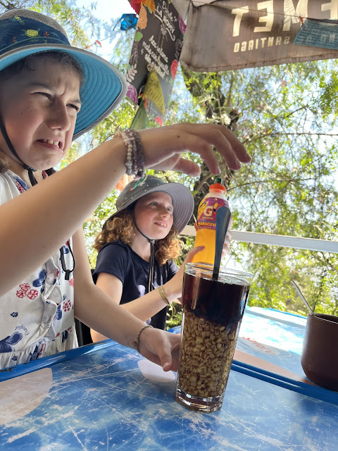 The next day Santiago charmed me through and through. We walked through the teeming Mercado de la Vega, which was an endless maze of delicious fruit and vegetable stalls (with one delicious coffee stand right in the middle, like something out of a modern-day Zelda game). We stopped in a used bookshop, browsed and bought some books ... then discovered there was a whole other one hidden behind it! So we browsed for another hour, and ended up with a backpack full of books. Then we went to Parque Bicentenario de la Infancia, which thrilled Tova with its hamster racecourse and pyramid of slides. Next we hiked up to Cerro San Cristobal in the scorching heat, where our flagging spirits were revived with a truly wicked Passionfruit Gatorade and a sickly-sweet glass of Mote Con Huesillo (it's like sugar syrup with lots of barley in it), plus empanadas. We walked home via the market, which we almost got locked into, and were thoroughly pooped.