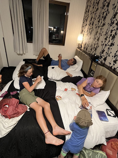 Then it was back to walking a few more hours. Levi’s forehead was still warm but she seemed content to just veg out in the stroller. The APA Hotel made a medium-sized fuss about our family size, but we held firm (having called them two days ago to confirm everything). We munched on sushi, pizza and pb sandwiches, feeling good about a long, pretty day of walking.